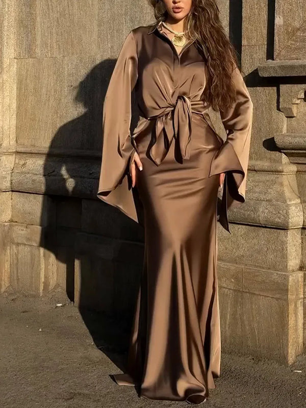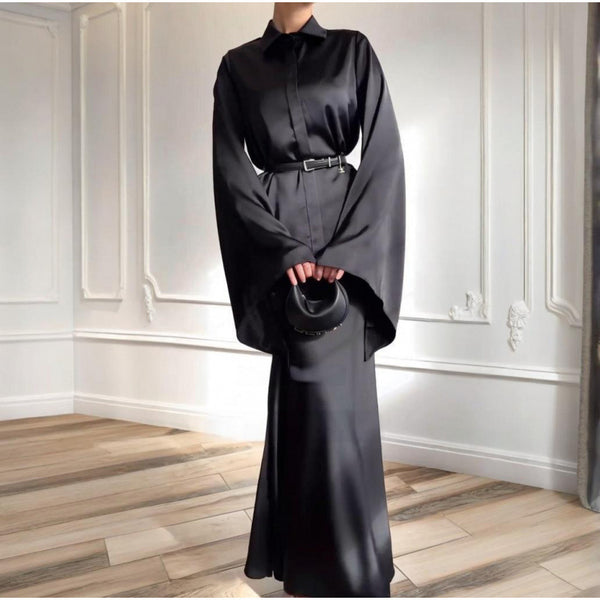 Elevate your wardrobe effortlessly with this elegant two-piece set featuring a wide-sleeve blouse and a high-waisted floor-length skirt. Made from luxurious satin fabric, this set offers a silky-smooth feel, subtle shine, and graceful drape that adds instant sophistication to your look. Whether you're heading to a dinner party, a work event, or a weekend outing, this versatile outfit ensures all eyes are on you.