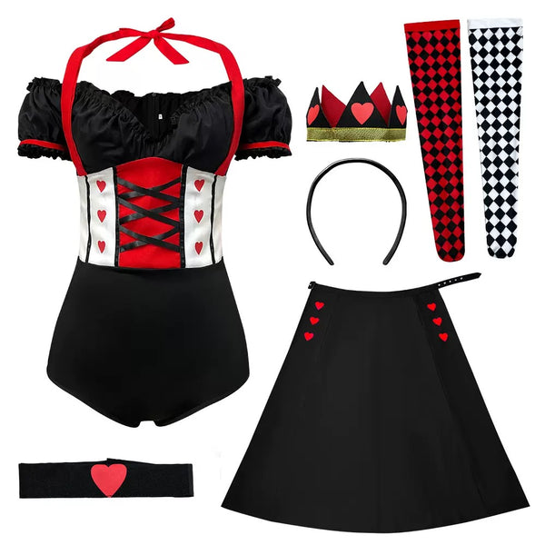 Complete Costume Set Includes: Heart-Detail Bodysuit: Snug, flattering fit that accentuates curves. Stretchable fabric ensures comfort while moving or dancing. Optional pairing with black hot pants or skirts (not included) for layered looks. Dramatic Wrap-Around Long Skirt: Open-front design adds elegance, movement, and a regal silhouette. Flowing fabric allows freedom of motion, perfect for stage or parties. Patterned Stockings: Red and black hearts motif adds playful, whimsical details. Completes the Queen of Hearts look with a balanced contrast. Crown Headband: Bold and sparkling accessory to establish a commanding presence. Black Choker with Red Heart: Adds a touch of gothic elegance and dramatic flair. Material & Comfort: Durable, lightweight, and breathable for all-day wear. Fitted bodysuit and wrap skirt provide structure while remaining flexible. Designed to flatter most body types with a bust around 88 cm (~34.6’’).