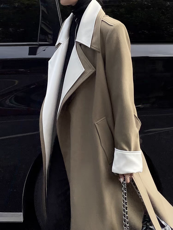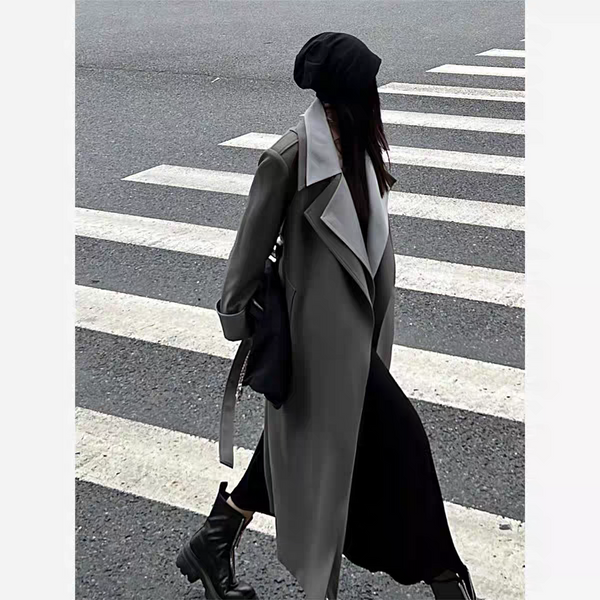 This coat embodies the modern woman’s need for elegance and practicality. The two-tone collar adds a contemporary twist to a classic wrap design, creating visual interest and a subtle statement without overpowering your look. The belted waist emphasizes a feminine silhouette while allowing adjustable comfort, making it suitable for various body types. Every detail, from the structured shoulders to the clean tailoring, reflects a balance of style, sophistication, and everyday wearability.