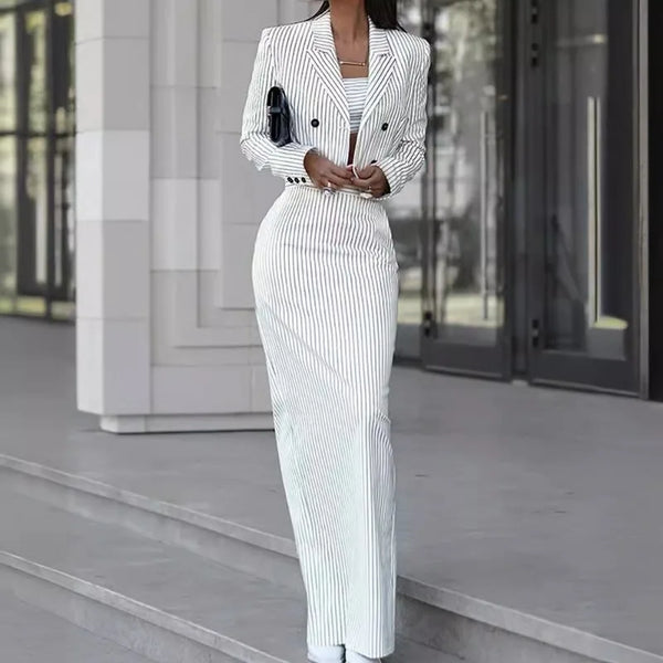 Make an elegant statement in the Chic Striped Women's Suit, a sophisticated two-piece set that brings together classic tailoring and contemporary style. Featuring timeless black and white vertical stripes, this ensemble visually elongates your figure and highlights your silhouette with confidence.