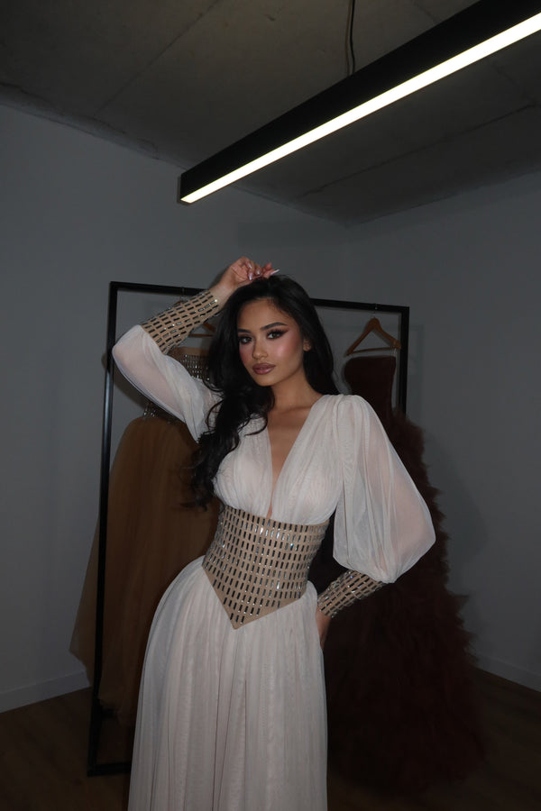 Its neutral tone and metallic detailing make it easy to accessorize — perfect for weddings, dinners, formal events, or photoshoots. Wherever you go, it ensures you shine with quiet sophistication.
