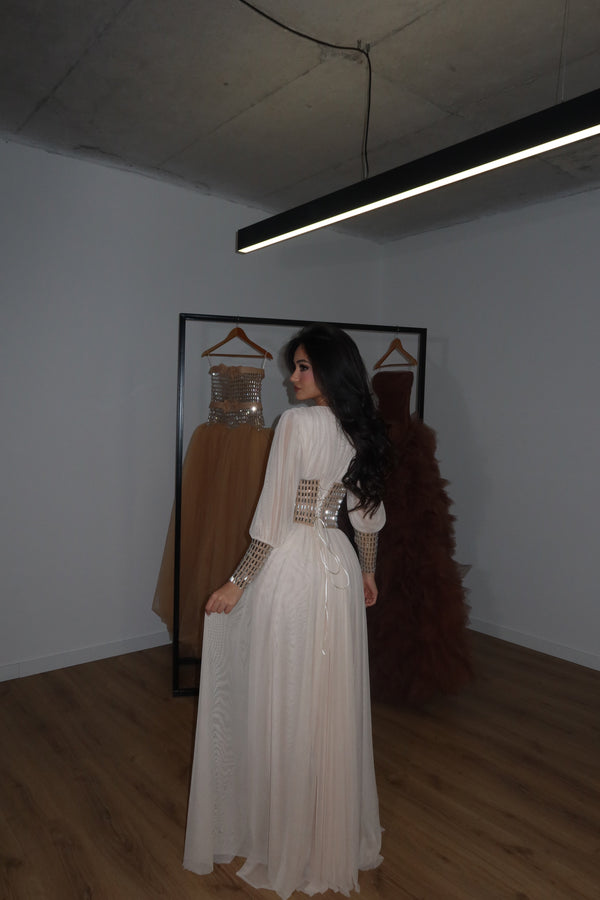 A gown that transforms to match every mood and season. Spring & Summer: Pair with strappy heels and golden jewelry for a luminous, romantic look under the evening sun. Autumn: Layer with a sleek shawl or tailored blazer for refined texture and warmth. Winter: Combine with a faux fur wrap and statement earrings for a regal, couture-inspired appearance. The gown’s neutral tone and metallic accenting make it endlessly versatile — perfect for weddings, galas, and intimate celebrations alike. Wherever the moment takes you, it ensures you move with grace, poise, and quiet power.