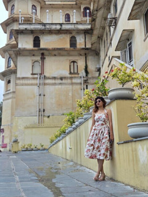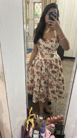 This dress looks stunning both in person and in photos. The floral pattern pops beautifully under natural light, and the cotton fabric keeps me cool even during summer shoots. Perfect for styling with a denim jacket or a straw hat.😊