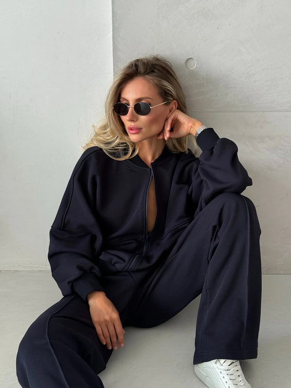 The oversized zip-up hoodie and wide-leg palazzo pants create a relaxed yet stylish silhouette. The hoodie’s roomy fit and zipper closure make layering effortless, while the straight-cut palazzo pants move naturally with your body. Ideal for active women who want both comfort and modern style.